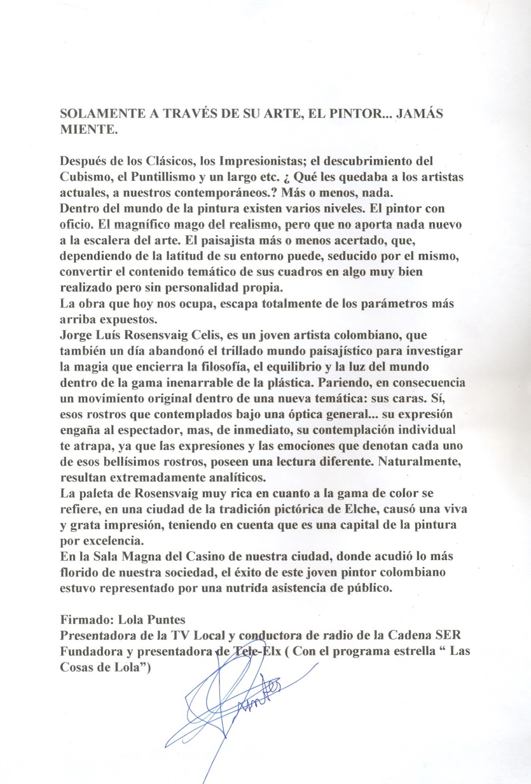 Un artista que ama su profesión, por lo que sin duda, nos sorprenderá en un futuro próximo, con trabajos bien pensados y elaborados, como acostumbra a hacerlo y esto, contribuirá a alegrarnos los sentidos y la vida.